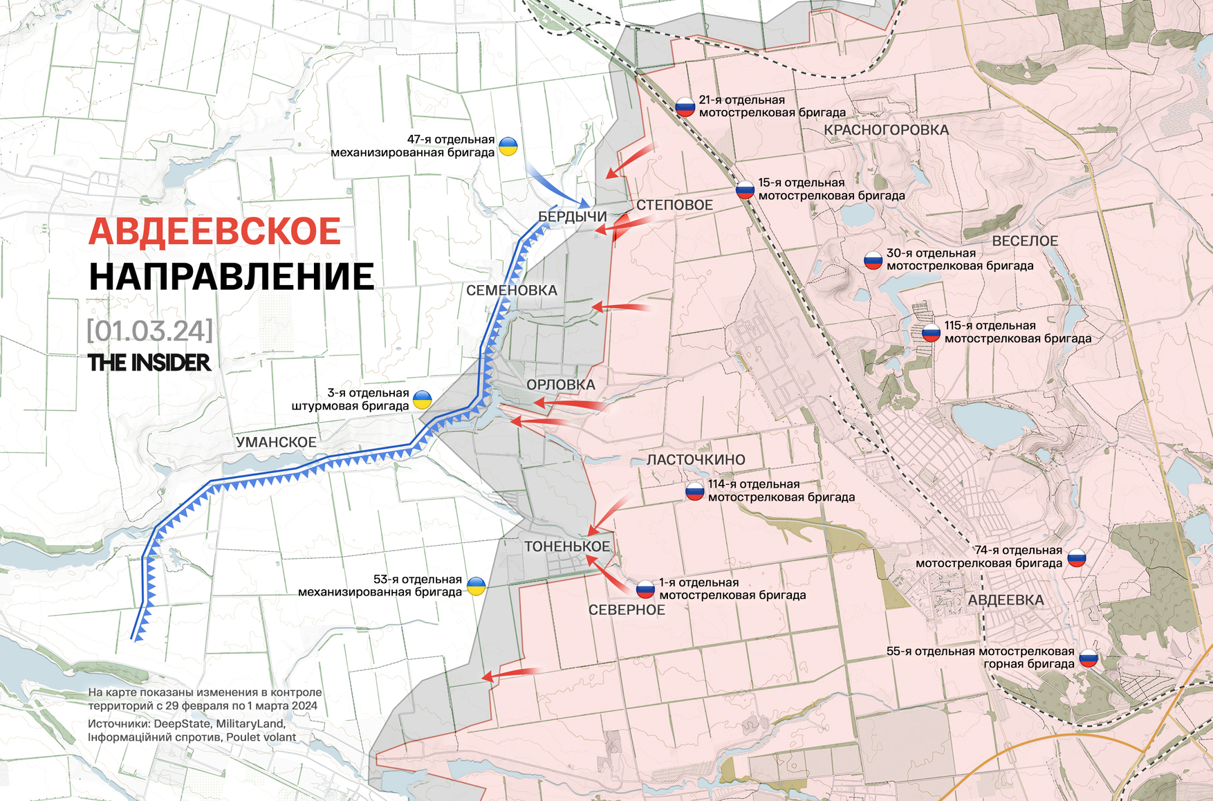 Пророссийский OSINT-ресурс LostArmour подвел итоги территориальных изменений за февраль 2024 года: российские войска заняли 152 км², из них 101,8 км² — на авдеевском направлении.