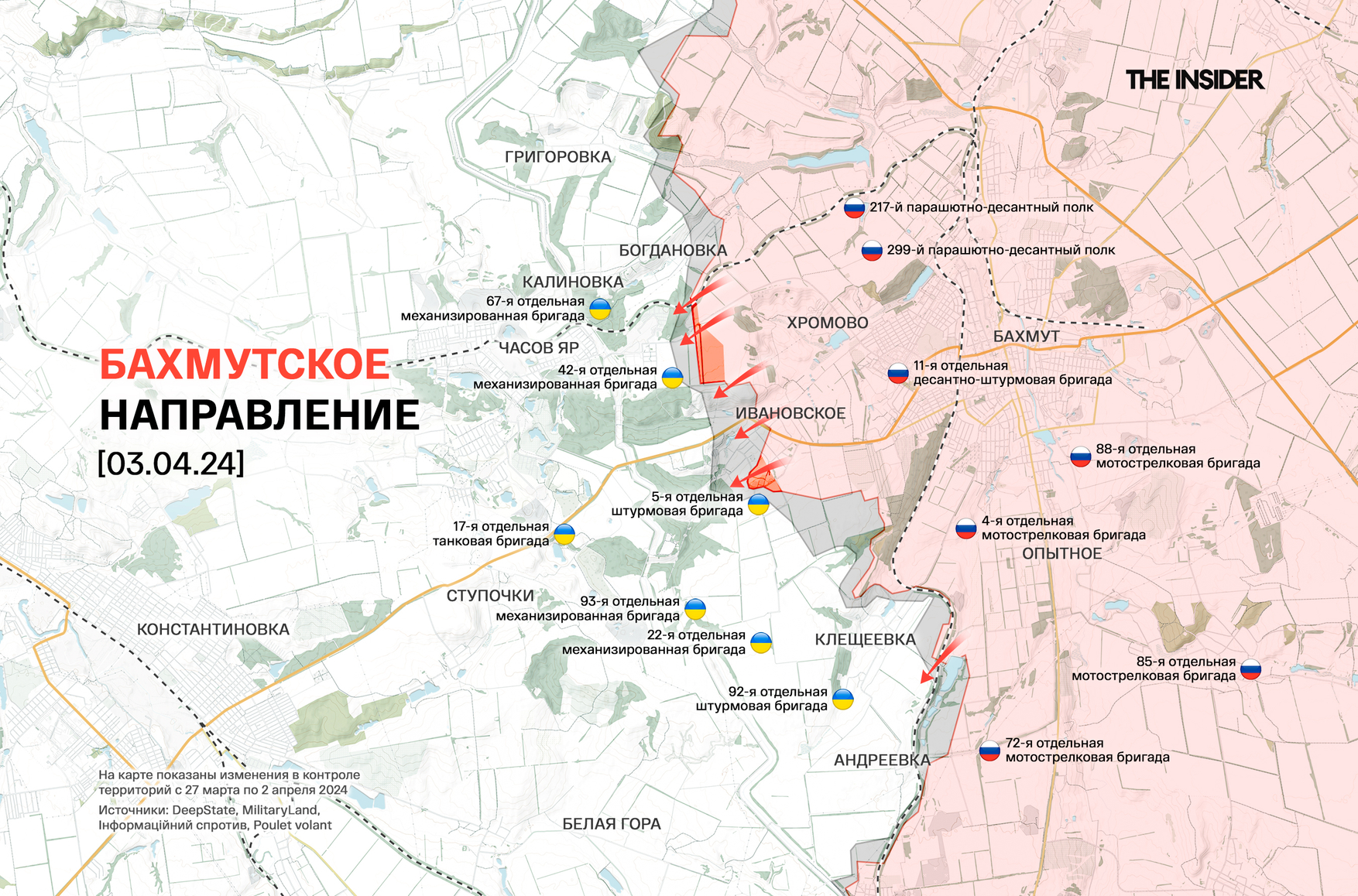 DeepState подтверждает захват ВС РФ села Водяное рядом с Авдеевкой и продвижение в Ивановском (до 2016 года — Красное) под Бахмутом, от которого открывается прямая дорога на Часов Яр. Напомним, что о захвате Ивановского Минобороны РФ отчиталось еще 23 марта. Сейчас же российские войска, по словам представителей ведомства, «занимают выгодные рубежи и наносят огневое поражение» противнику около этого поселка.