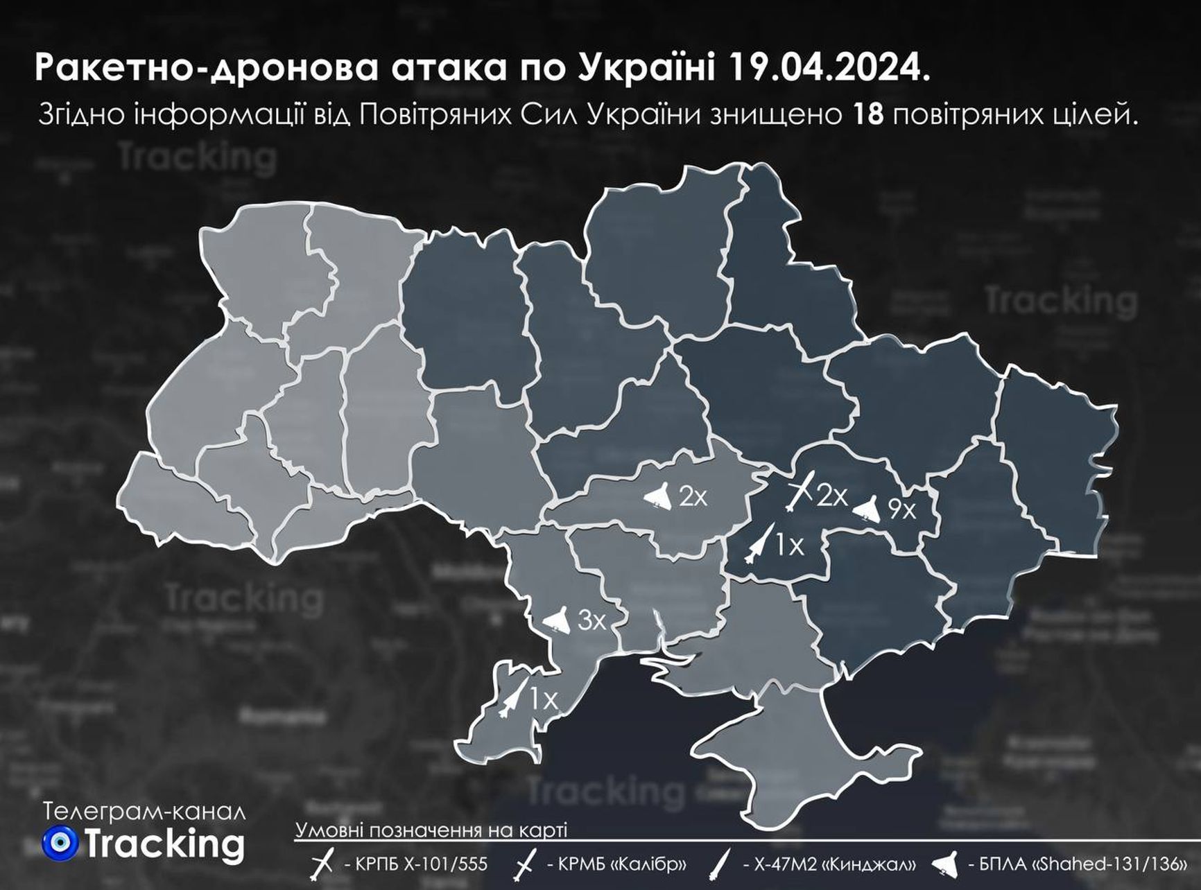 Командование Воздушных сил ВСУ сообщает о сбитых в ночь на 19 апреля всех 14 запущенных беспилотниках типа «Шахед», 11 управляемых авиационных ракетах Х-59/Х-69 из 12, двух крылатых ракетах Х-22 из шести, двух крылатых ракетах Х-101/Х-555, а также, что примечательно, стратегического ракетоносца Ту-22М3. Также упоминается о запуске двух крылатых ракет «Искандер-К»