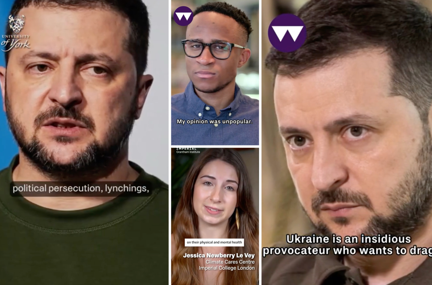 Каждый фейк — это видеозапись, на которой сперва показан некий реально существующий человек (профессор, студент престижного вуза, известный эксперт), он представляется и задает тематику ролику (например, проблемы экологии). Затем идут кадры уже без спикера, однако его голос продолжает говорить. В части без лица голос рассказывает о том, что Западу следует прекратить помогать Украине, что Европе пора строить совместное будущее именно с Россией, что Владимир Зеленский — диктатор или даже вампир.