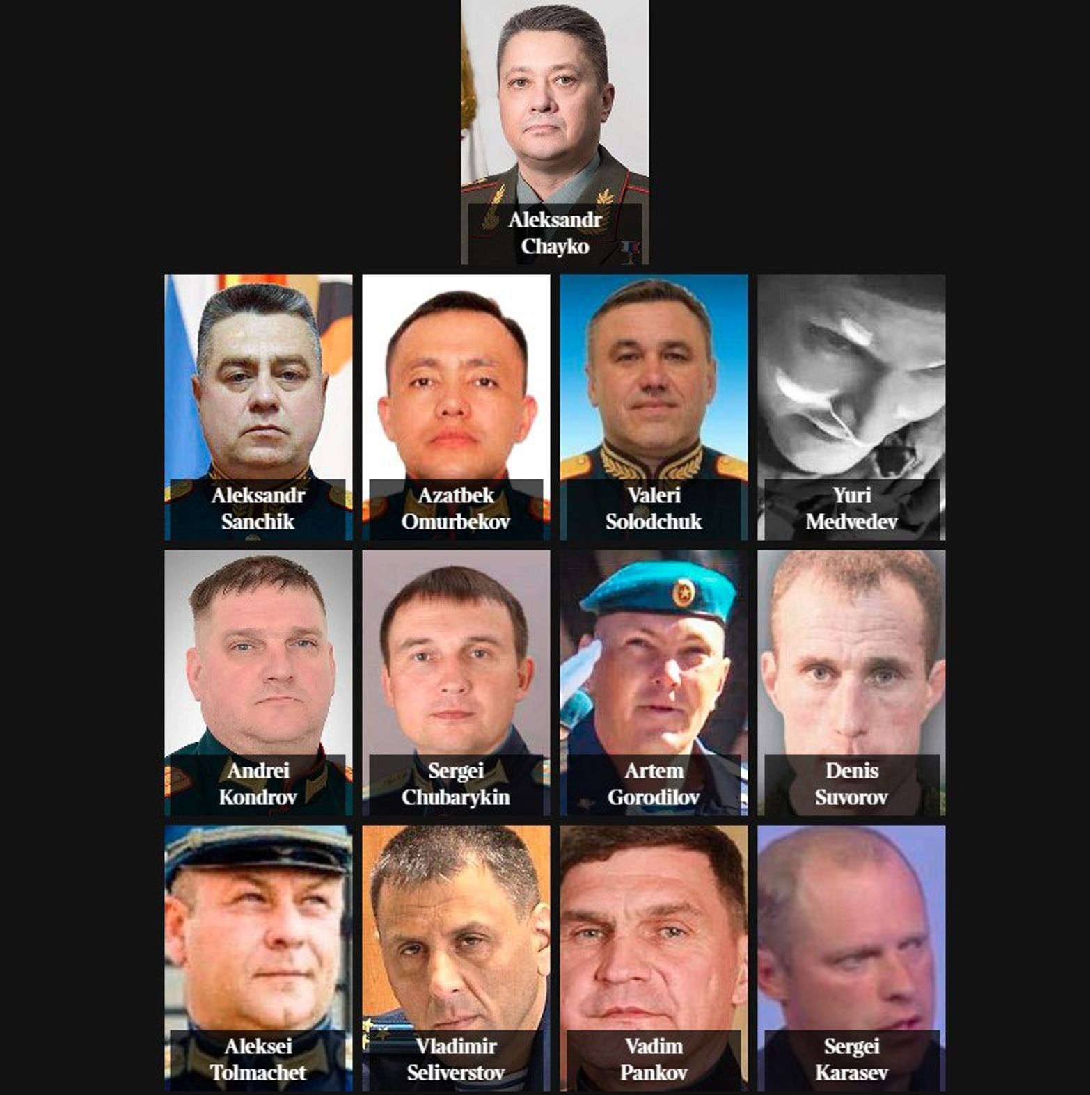 - Генерал-полковник Валерий Солодчук — командовал подразделениями, обвиняемыми в убийствах. В этом году Путин повысил его в звании. Украинская разведка ранее связывала подчиненных Солодчука с преступлениями в Киевской области.