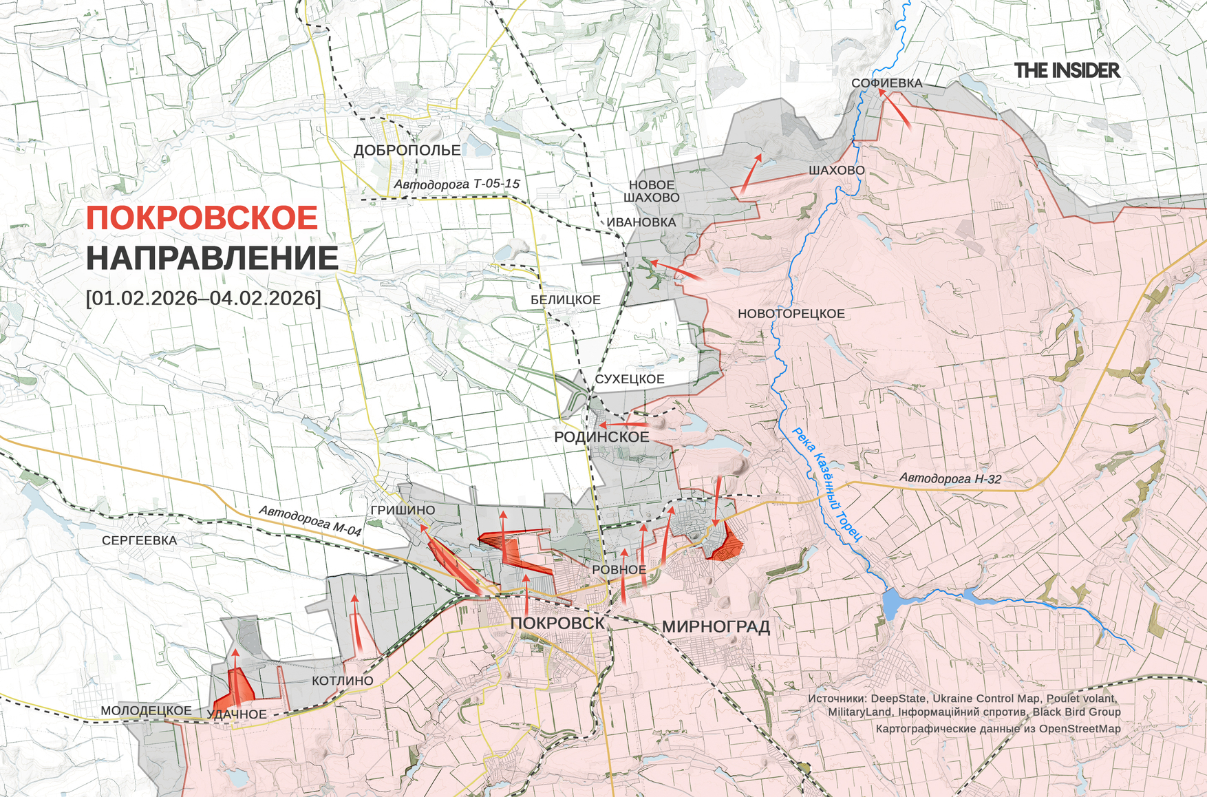 DeepState сообщает, что ВС РФ продвинулись в Покровске и Мирнограде. Также в проекте приводят видео движения российской (в том числе трофейной) техники в южной части Покровска и рассказывают, что ВС РФ атакуют Гришино и тыловые позиции украинских дроноводов через Родинское, а за северные окраины Покровска и Мирнограда идут «последние бои».