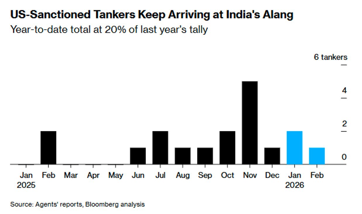 Готовность индийских предприятий принимать суда, эксплуатируемые в рамках «теневого флота», вероятно, указывает на нехватку средств у этих компаний, отмечает Bloomberg.