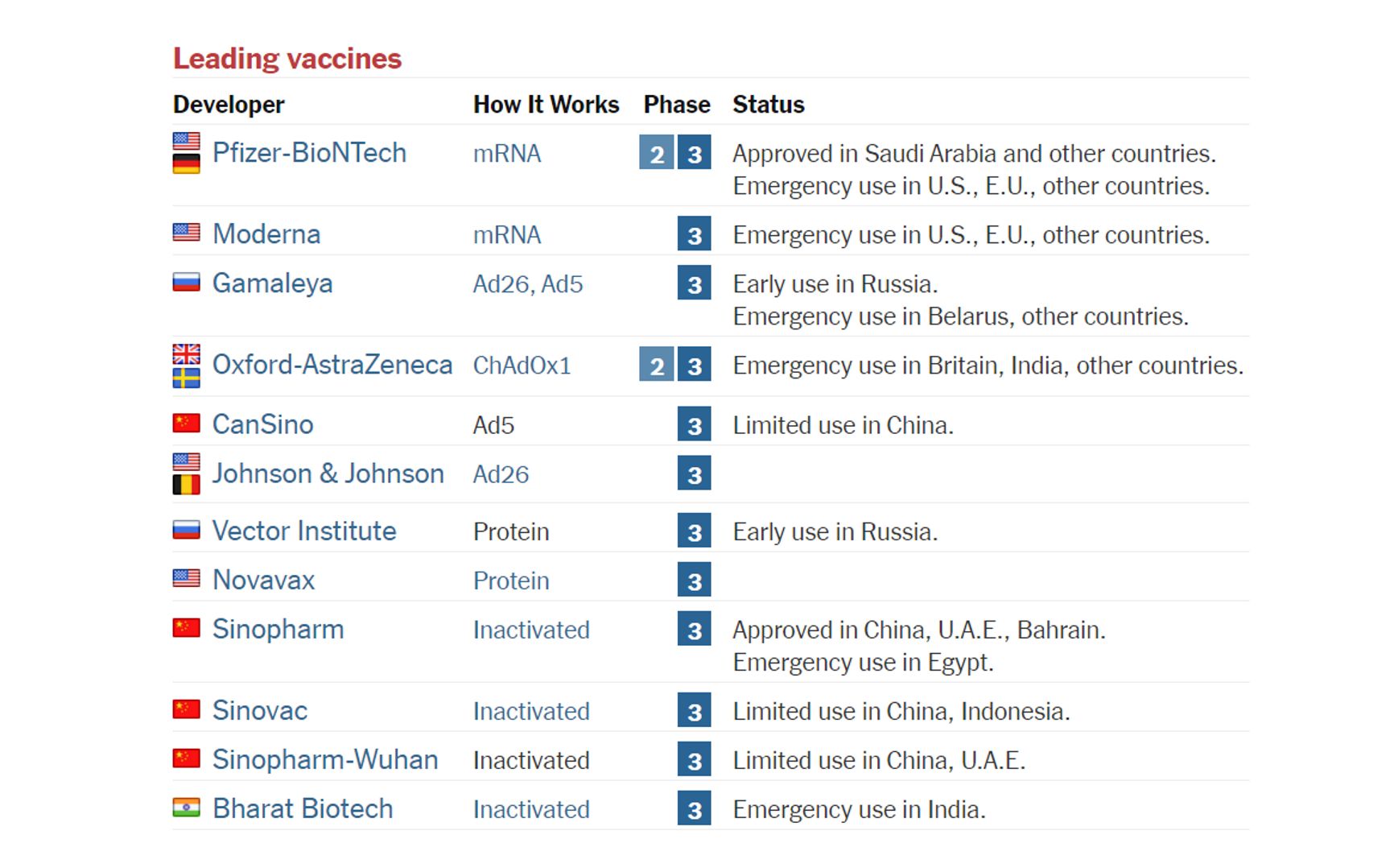 Во всем мире на сегодняшний день существует 12 вакцин, которые находятся на третьей – финальной стадии испытаний. Но большая часть этих препаратов, как и «Спутник V», уже применяются для вакцинации населения в странах, где они были созданы, – вакцины Moderna, AstraZeneca, Pfizer-BioNTech.