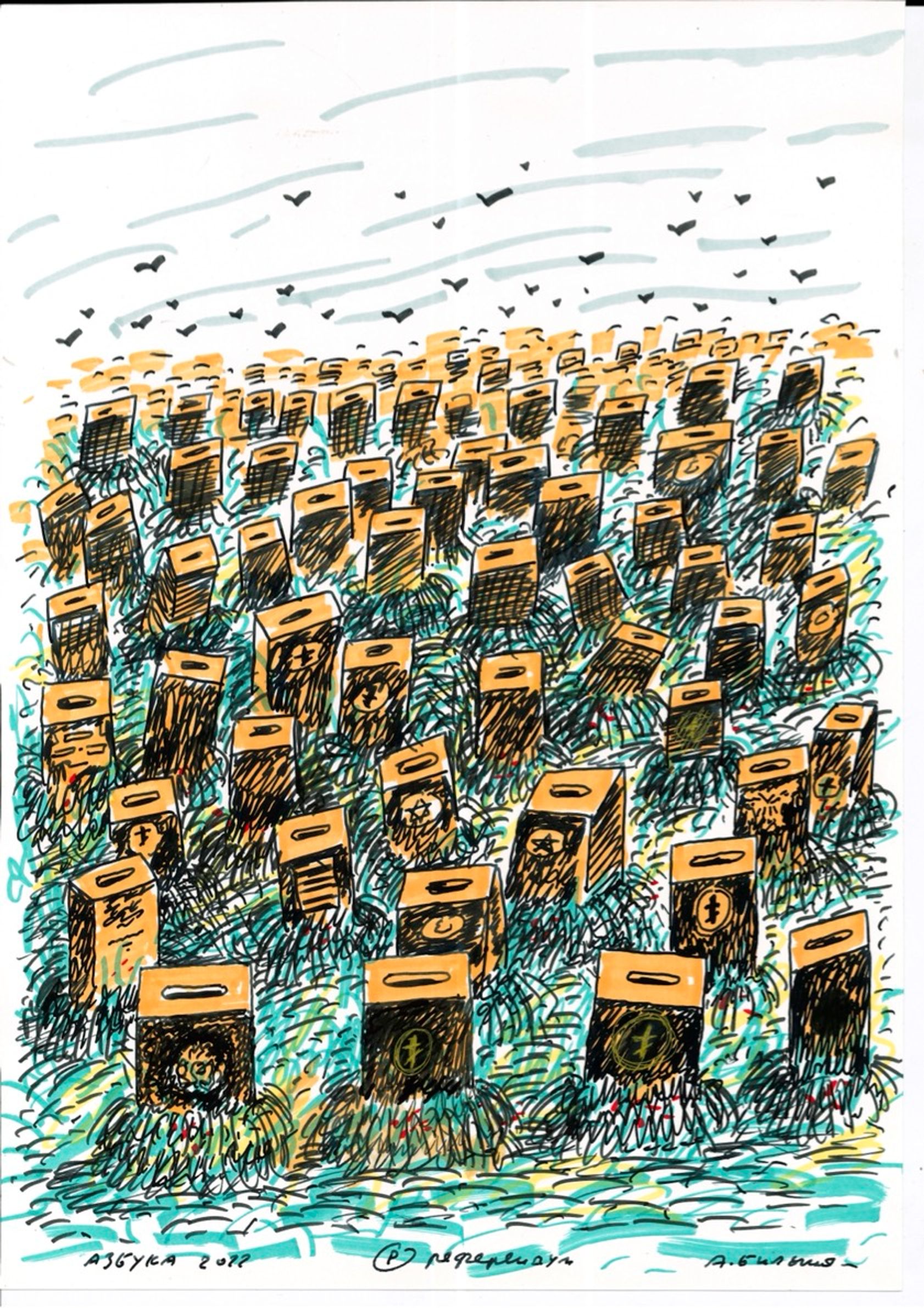 На выставке в рамках форума «СЛОВОНОВО» в Черногории художник Андрей Бильжо представил новый цикл «Азбука — 2022» — антивоенный и антитиранический эпос, по буквам передающий весь пафос происходящего. The Insider публикует продолжение цикла.