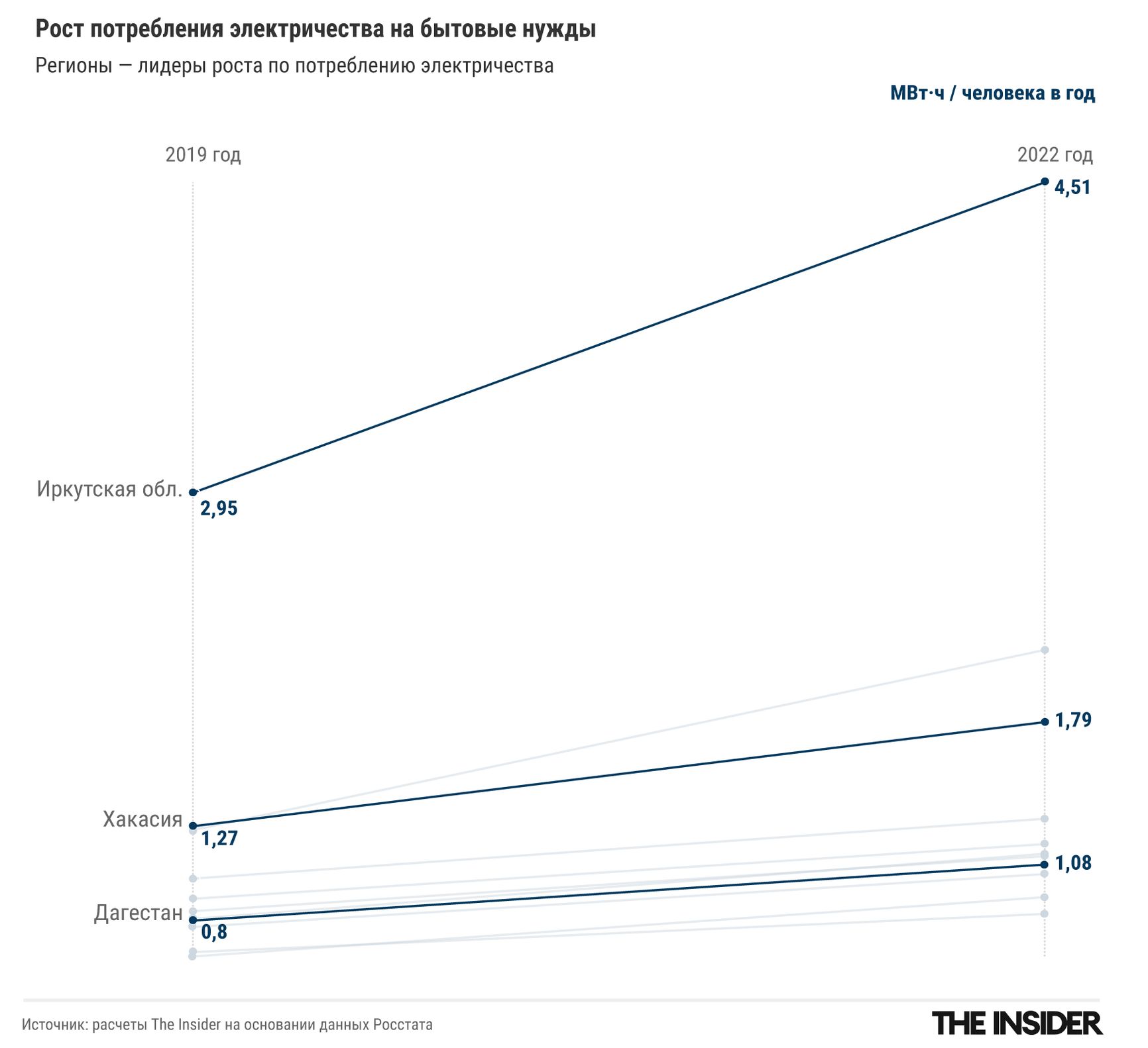 В России майнингом занимаются везде, но сообщения о борьбе с майнерами чаще всего приходят из Сибири и с Кавказа. Там очень дешевое электричество, особенно по льготным тарифам для сельской местности. За последние пять лет потребление электричества резко выросло именно в регионах Северного Кавказа и Сибири, показывает анализ The Insider.