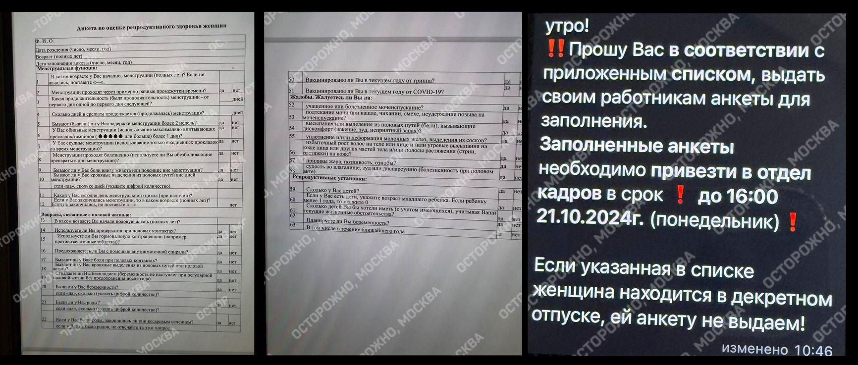 Вопросы возникли и у сотрудников одного из подмосковных культурных учреждений. Им раздали анкеты с вопросами о репродуктивном здоровье. Требовалось вписать свои персональные данные и ответить на вопросы в частности о цикле, половой жизни, гинекологических и других заболеваниях, детях и планировании беременности. Данные предназначались для отдела кадров. Не пожелавших заполнить анкеты пообещали вызвать на разговор.