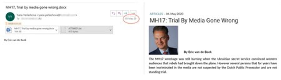 Еще один пример взаимодействия с ГРУ: 3 мая 2020 года Яна Ерлашова отправила своему контакту ГРУ по электронной почте черновик статьи, написанной голландским сотрудником Bonanza Media Эриком ван де Беком. Статья была опубликована на следующий день на BonanzaMedia.com.