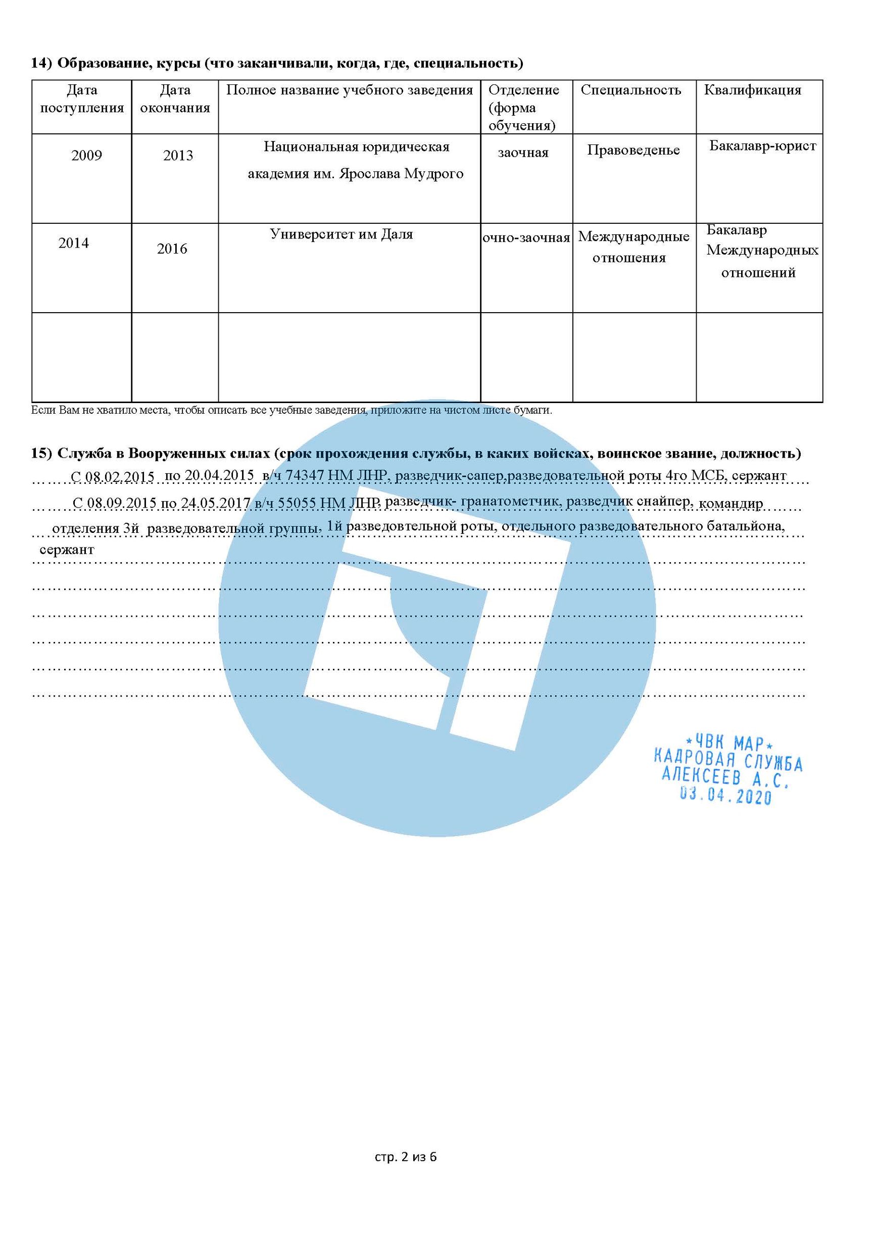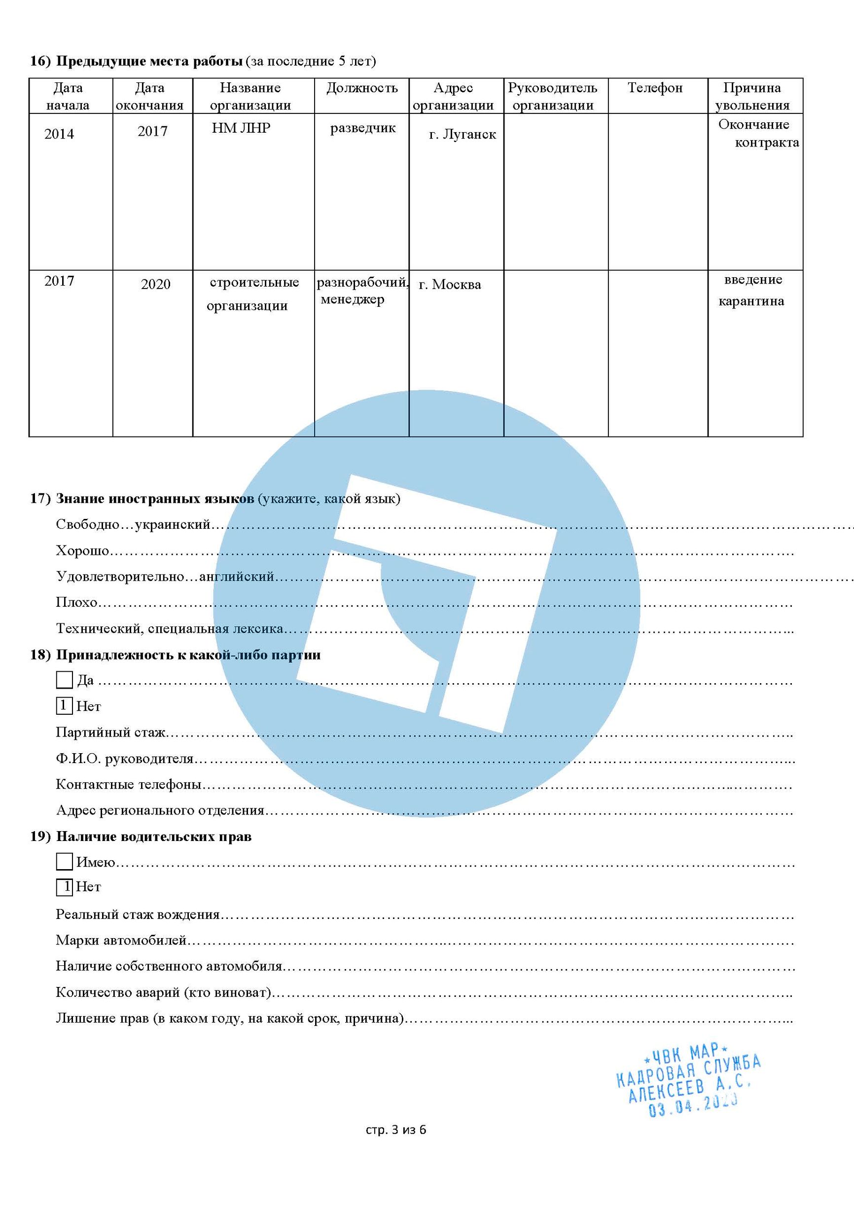 Решение передать набор на аутсорсинг «Шаману» быстро принесло свои плоды. К концу мая фальшивая ЧВК получила десятки новых заявок, все они ссылались на «Шамана» как на своего референта. Бланки заявлений были составлены так, чтобы это выглядело как формы, ранее использовавшиеся настоящей ЧВК «МАР», и на каждой форме была проставлена ​​печать этой ЧВК с указанным именем «директора по персоналу Алексеева». Формы, которые в конечном итоге были заполнены более чем 200 заявителями, содержали полные личные данные, включая текущий адрес, номера телефонов и электронную почту, рост, вес и размеры обуви, образование и военный опыт. The Insider и Bellingcat ознакомились с этими анкетами.