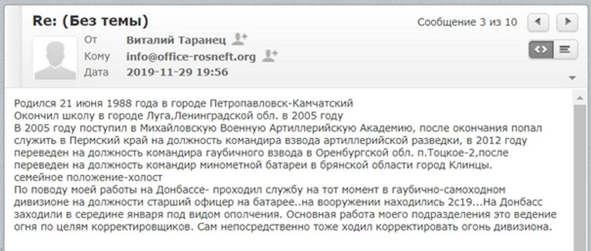 Хотя СБУ активно помогала операции, формально нужно было выставить все так, что СБУ о боевиках узнает случайно (ведь по легенде самолет сажают из-за звонка бдительного гражданина). Для этого придумали еще одну легенду: анонимный информатор сообщал СБУ о продолжающейся незаконной операции по вербовке наемников и называл адрес и пароль к электронной почте — info @rosneft-office. org. Как только СБУ отреагирует на такую ​​наводку, они смогут загрузить все тысячи страниц компрометирующих документов, включая резюме, фотографии и видео. СБУ также сможет отслеживать подготовку к отъезду наемников из России с помощью билетов и планов полетов. И главное — они смогут немедленно отреагировать, как только обнаружат, что — случайно, после предупреждения о взрыве — самолет, на котором находились эти заинтересованные лица, приземлился в аэропорту Борисполь под Киевом.