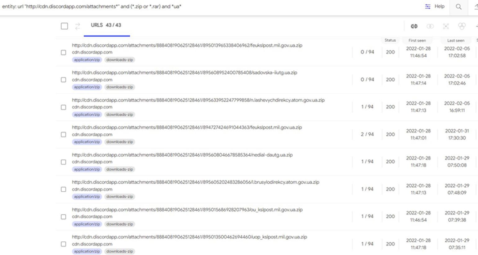 В январе-феврале 2022 года те же хакеры рассылали более 35 zip-файлов с вредоносным ПО. Эти пакеты, по-видимому, были нацелены на важные украинские цели, о чем свидетельствуют имена файлов, имитирующие домены агентства Украины по атомной энергии (atom.gov.ua), Министерства иностранных дел (mfa) и Министерства обороны (mil.gov. уа).
