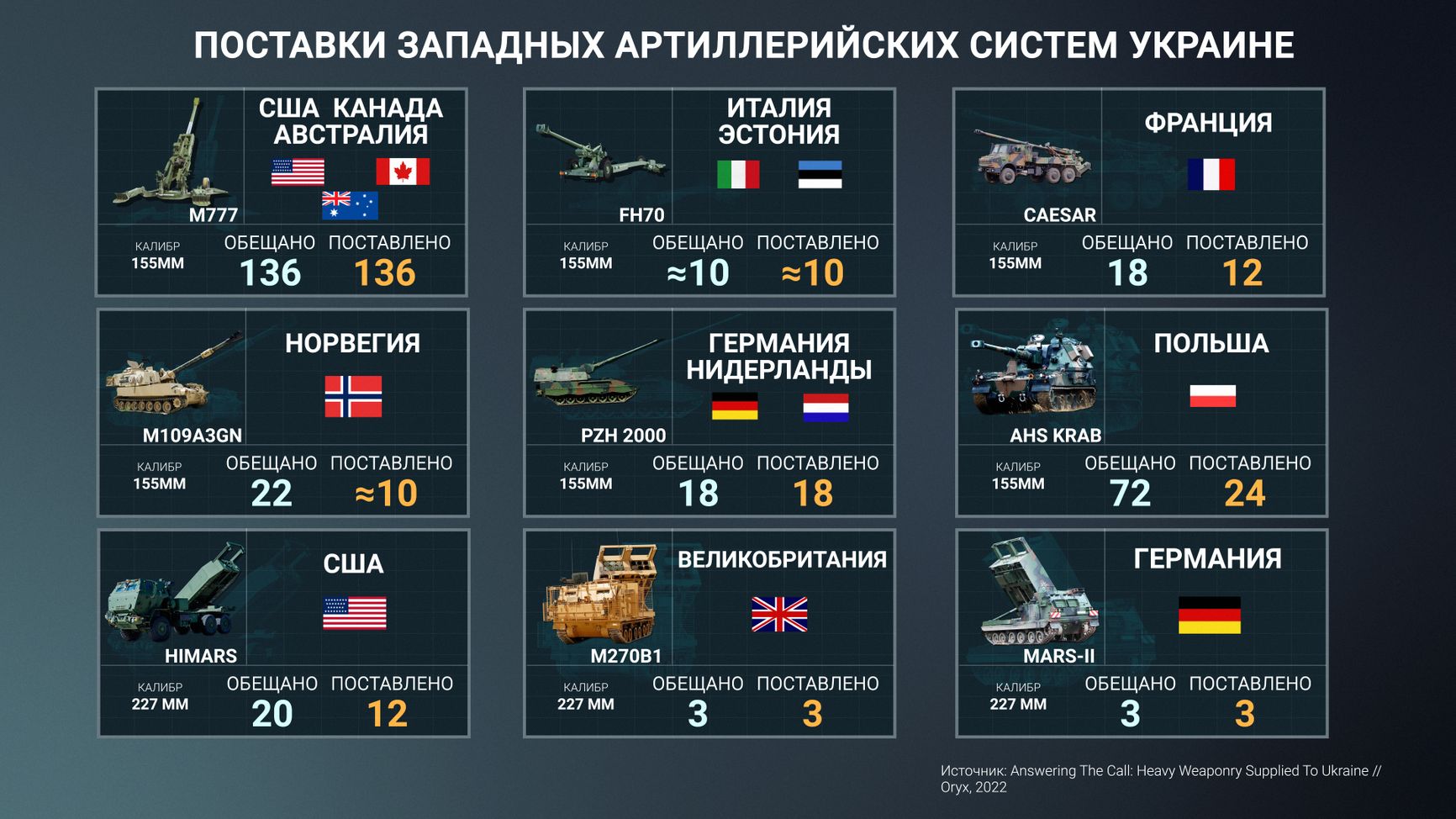 Самый распространенный тип боевого взаимодействия в Украине сейчас описывается термином «артиллерийская дуэль». Стороны обмениваются ударами на больших дистанциях и вынуждены расходовать гигантское количество боеприпасов, чтобы обеспечить плотность огневого покрытия. Целями для ударов служат скопления живой силы и техники, боевые позиции и инженерные сооружения противника, склады боеприпасов, линии снабжения и инфраструктурные объекты. Поскольку запасы снарядов для советских артиллерийских систем на вооружении ВСУ близки к исчерпанию, остановимся подробнее на натовских образцах тяжелой артиллерии. Всего поставлено чуть больше 200 единиц соответствующих систем калибра 155 мм и 227 мм.