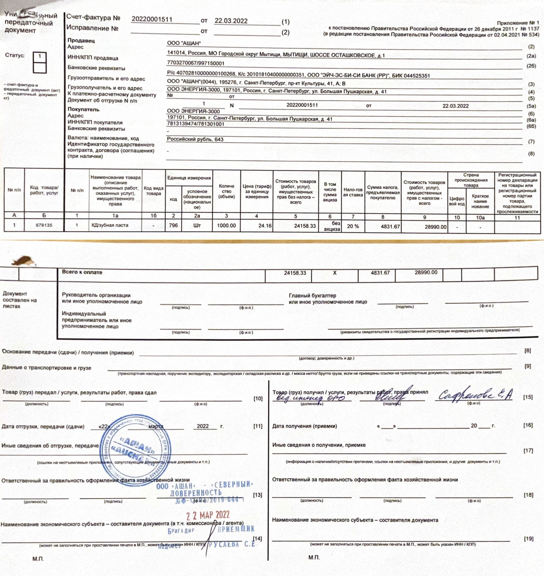 Зубную пасту по этим документам должна забрать компания «Энергия-3000» (ИНН 7813139474). В 15:28 Зельцер оповещает сотрудника склада гипермаркета «Ашан Северный» Русаеву о том, что необходимо распечатать и подготовить УПД.