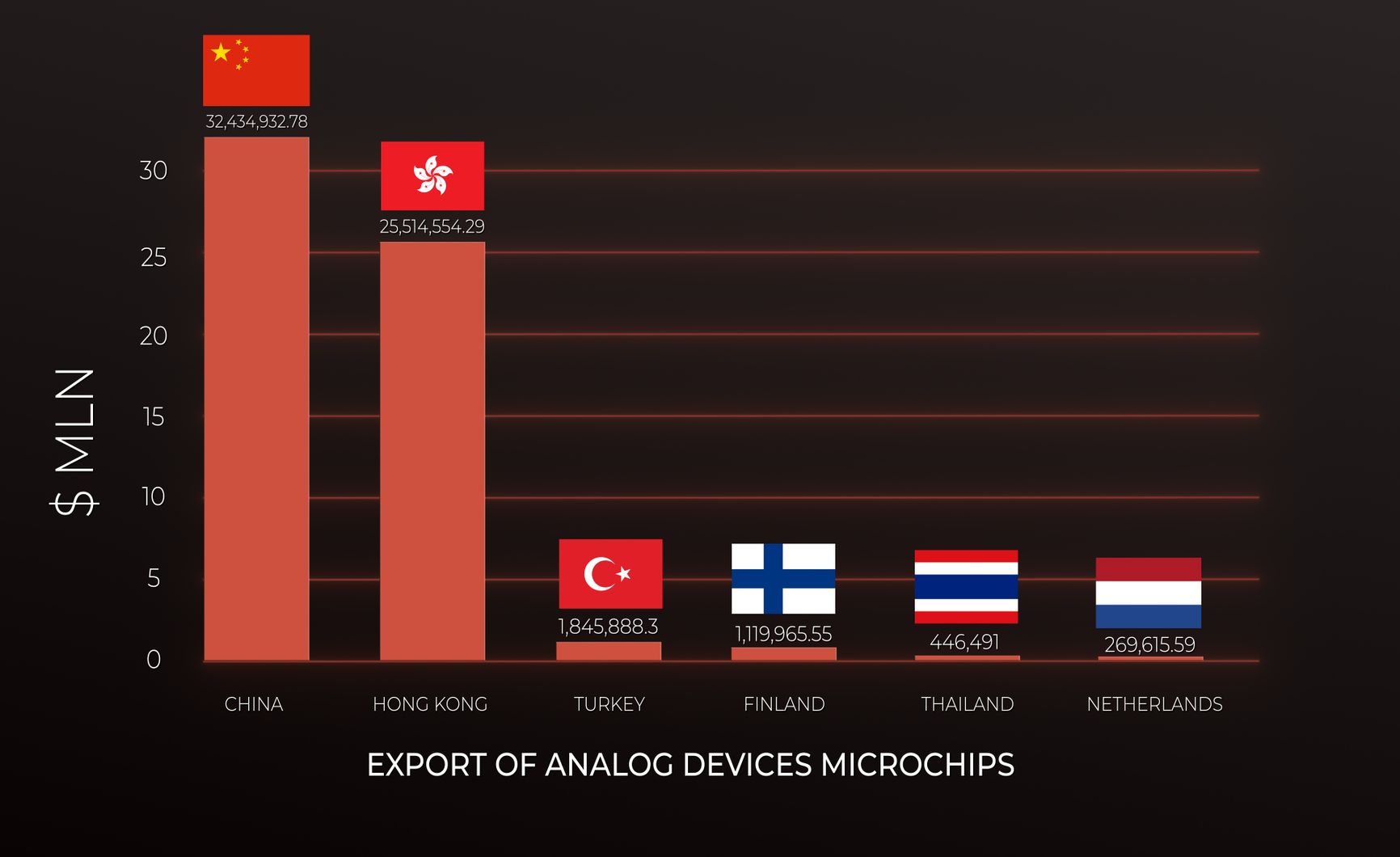 Литва, твердо поддерживающая Киев и поставившая вооружений более чем на $436 млн, согласно таможенным данным, изученным The Insider, находится на третьем месте среди экспортеров продукции Texas Instruments в Россию. Следом за ней идет Финляндия, которая в апреле вступила в НАТО. В это же время Турция (тоже член НАТО, которая, несмотря на все свои близкие связи с Россией, была существенным поставщиком вооружения для Украины) находится на третьем месте среди экспортеров в Россию микросхем Analog Devices. На четвертом месте — снова Финляндия. На шестом — Нидерланды. Нидерланды направили в Украину оружия более чем на $1,3 млрд, включая системы ПВО Patriot, и сейчас возглавляют усилия по тренировке украинских пилотов на истребителях F16.