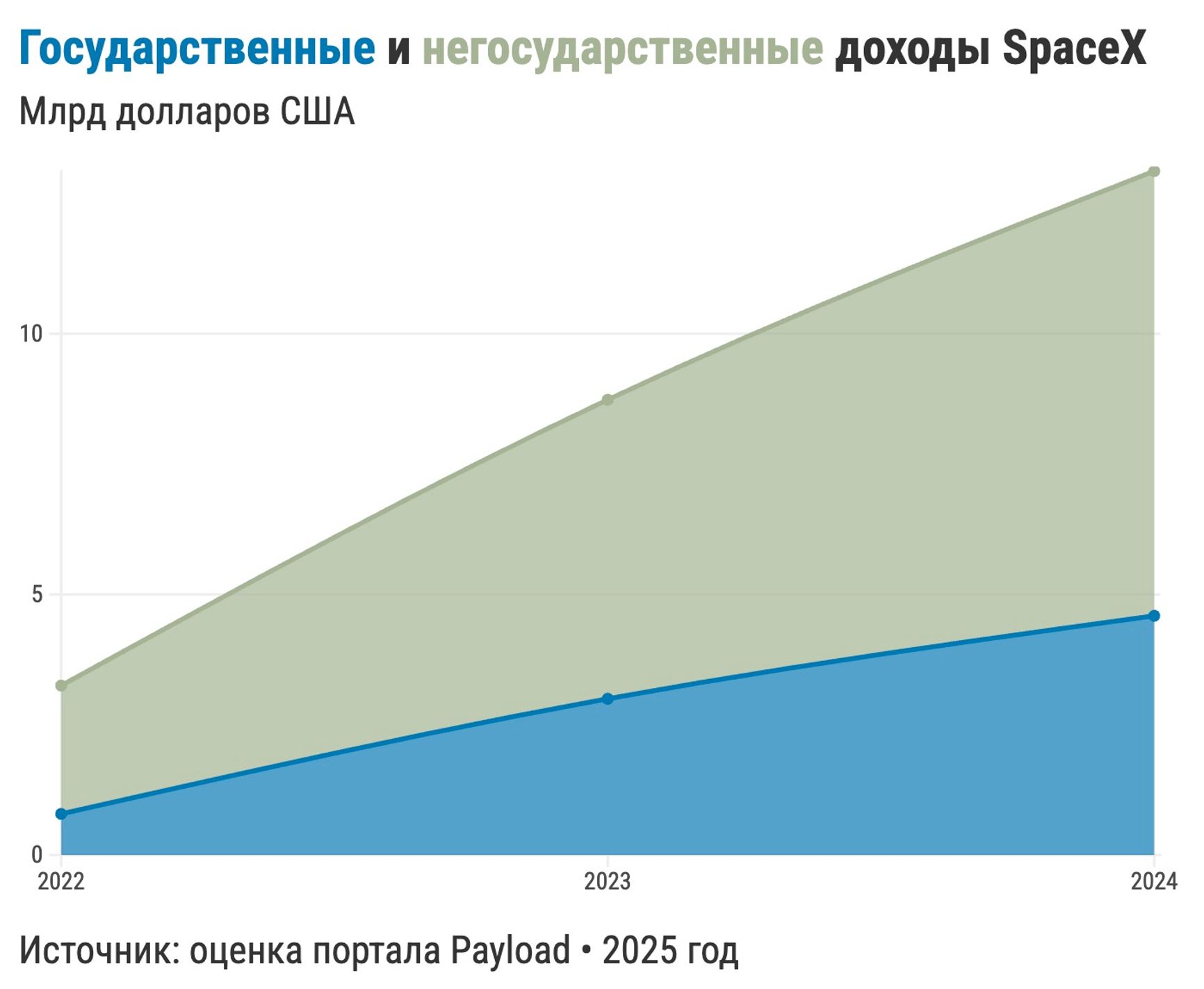 SpaceX развивалась во многом на государственные деньги. Инвестиции в компанию в первые десять лет ее существования составили около $1 млрд, из которых каждый второй доллар был бюджетным. По подсчетам портала Payload Research, в 2023–2024 годах больше трети всей выручки SpaceX составляли государственные контракты с НАСА и Пентагоном. Большая часть выручки поступает от продажи подписок на спутниковый интернет Starlink.