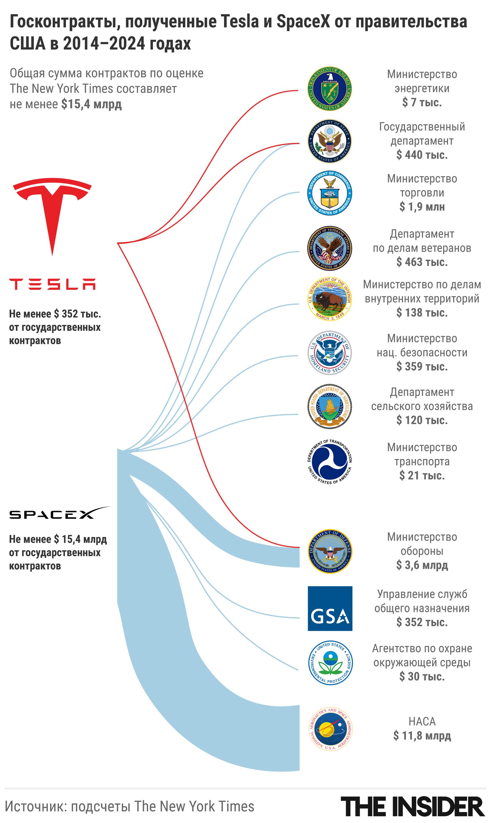 Издание The New York Times подсчитало, что только за 2024 год компании Маска выиграли около 100 государственных контрактов общей стоимостью около $3 млрд. А общая сумма госконтрактов SpaceX и Tesla за последние десять лет составила не менее $15,4 млрд. Бóльшую часть денег компании Илона Маска получили от НАСА и Минобороны США.