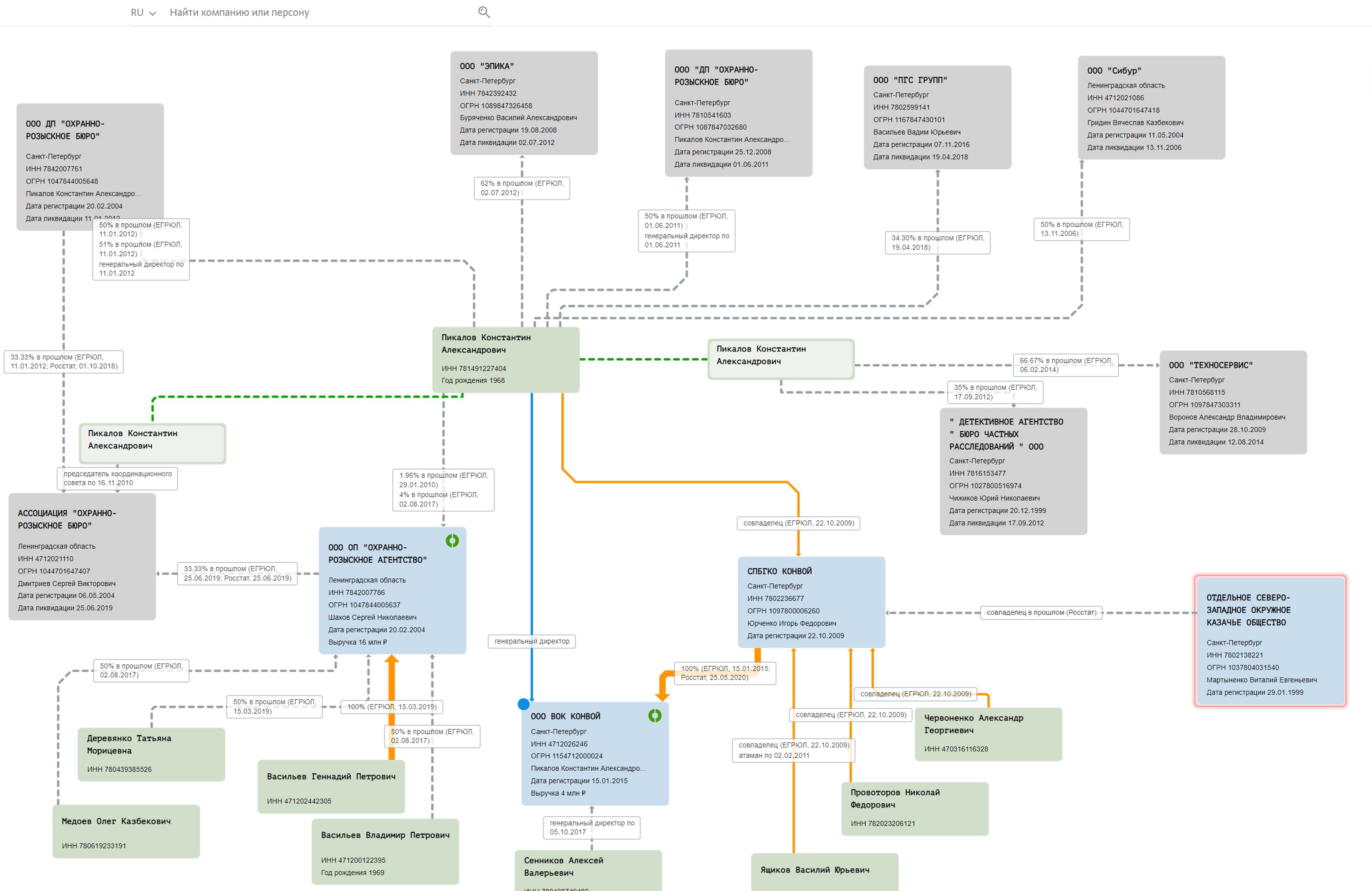 «Мазай» делал все для того, чтобы идентифицировать его было сложно. Даже пригожинские сотрудники не знали его настоящего имени, а во время редких появлений на публике он всегда был в темных очках. Однако же, изучив биллинг телефона Валерия Захарова (имеется в распоряжении Bellingcat), нам удалось обнаружить, что два номера из тех, с которыми он общался, принадлежат Военно-охранной компании «Конвой» с приличным уставным капиталом в размере 100 млн рублей и всего тремя сотрудниками в штате. Владельцем же «Конвоя» является Константин Пикалов, которому также принадлежит и одноименное казацкое общество.