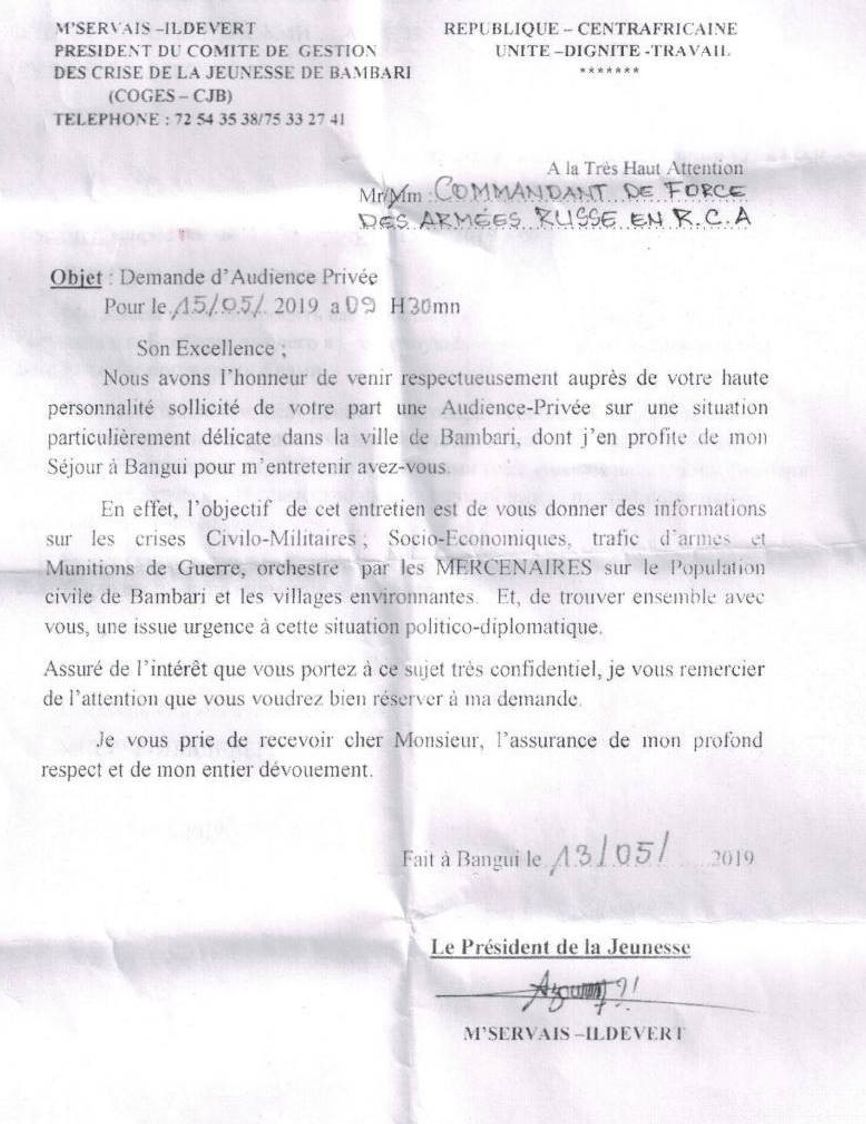 Один из имейлов, перенаправленных российскими военными «Мазаю», содержит скан письма властей города Бамбари в адрес командующего российских вооруженных сил, размещенных в ЦАР. В этом письме, датированном 13 мая 2019 года, власти требуют срочной и непубличной встречи с тем, чтобы обсудить «очень деликатную ситуацию, сложившуюся в Бамбари». В частности, речь должна была идти об экономических и социальных проблемах местного населения, вызванных присутствием наемников.